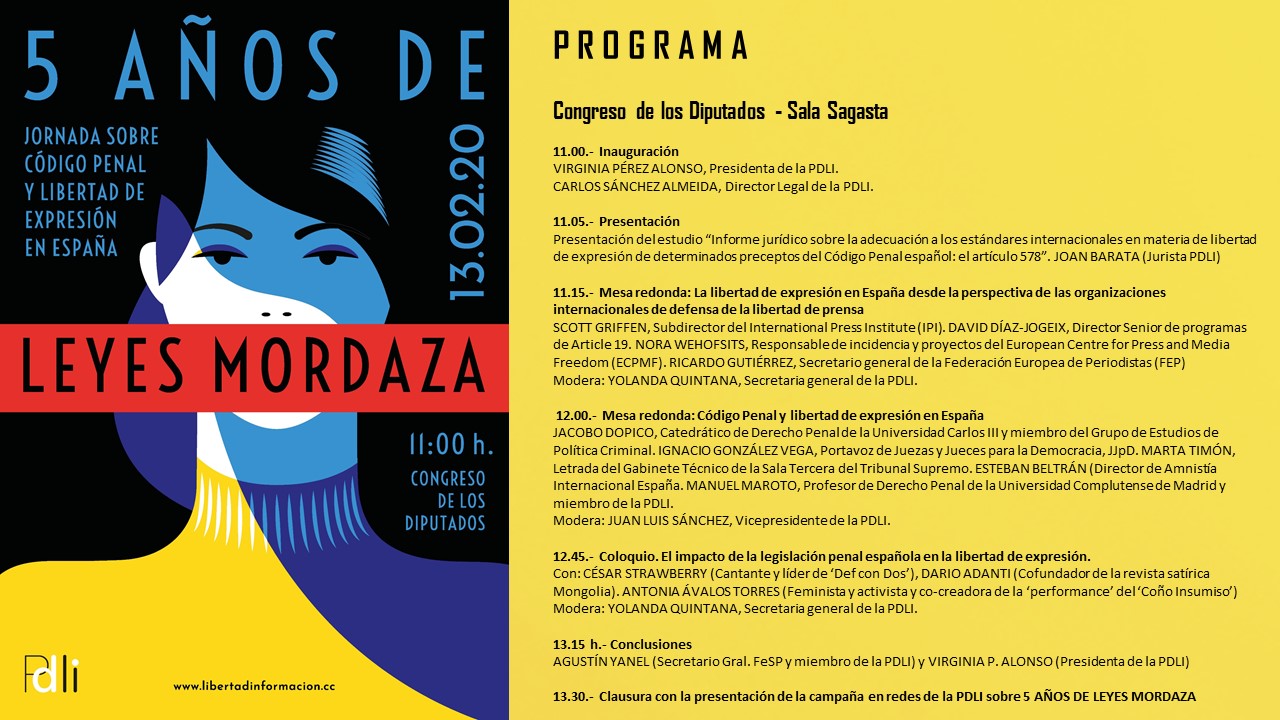 Con motivo del quinto aniversario de la aprobación de las normas conocidas como ‘Leyes Mordaza’, la Plataforma en Defensa de la Libertad de Información (PDLI) ha invitado a las principales organizaciones internacionales de defensa de la libertad de expresión y a juristas especializados para participar en una Jornada que tendrá lugar en el Congreso de los Diputados, este jueves 13, a partir de las 11:00h.